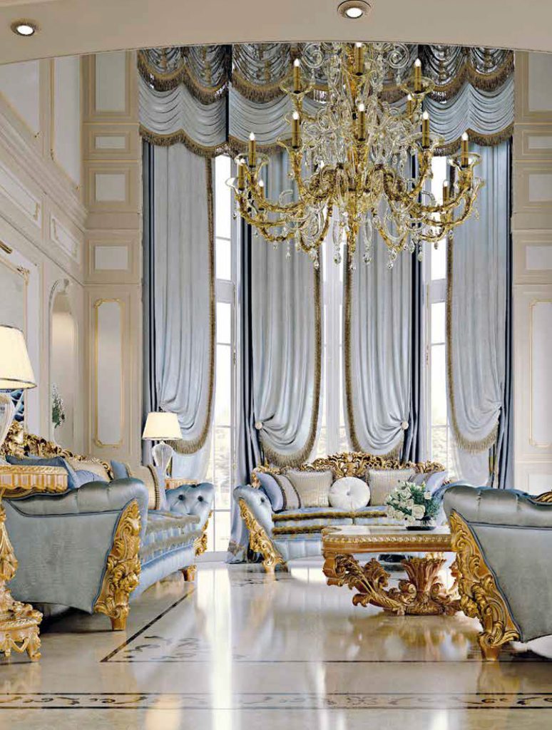 This living room embodies the pinnacle of classical luxury, where majestic volumes, opulent draperies and intricate gold detailing converge to create an atmosphere of royal sophistication.