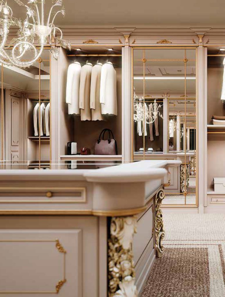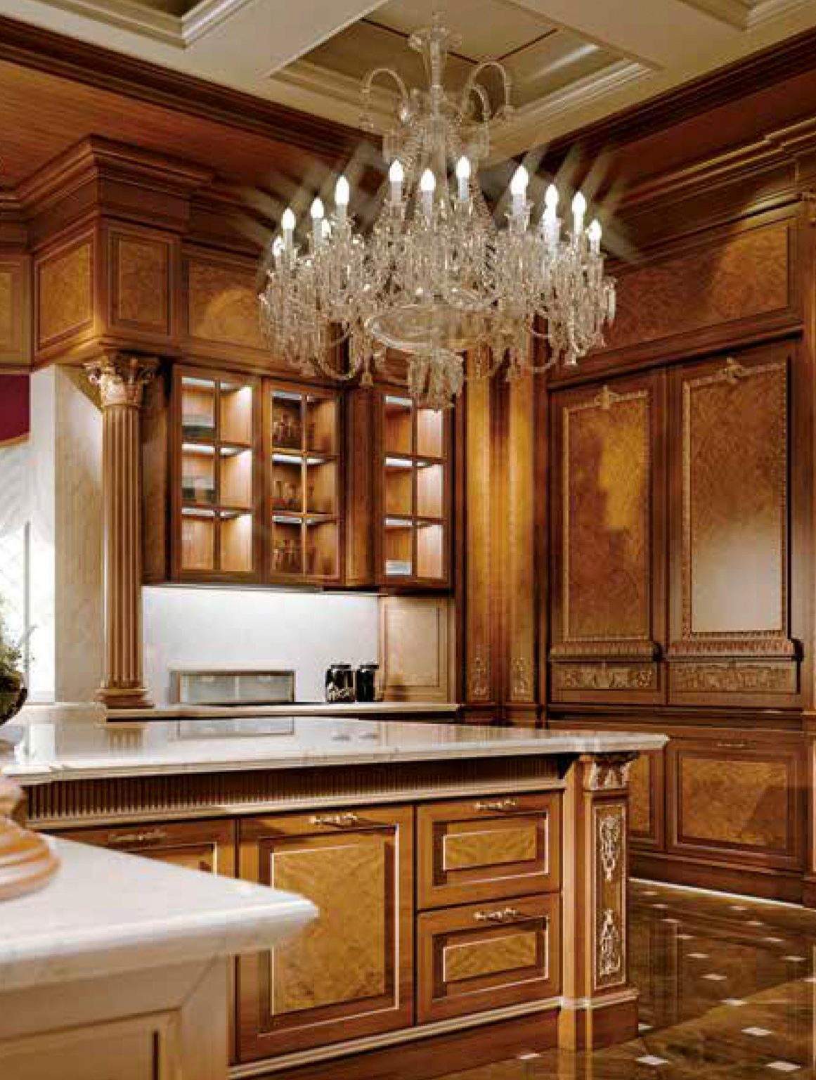 This majestic kitchen showcases the timeless art of classic cabinetry, with grand volumes, fluted columns and refined inlays.